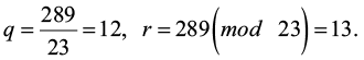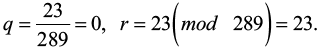 Расширенный алгоритм Евклида позволил найти обратный элемент к числу 23 по модулю 289, он равен 88.