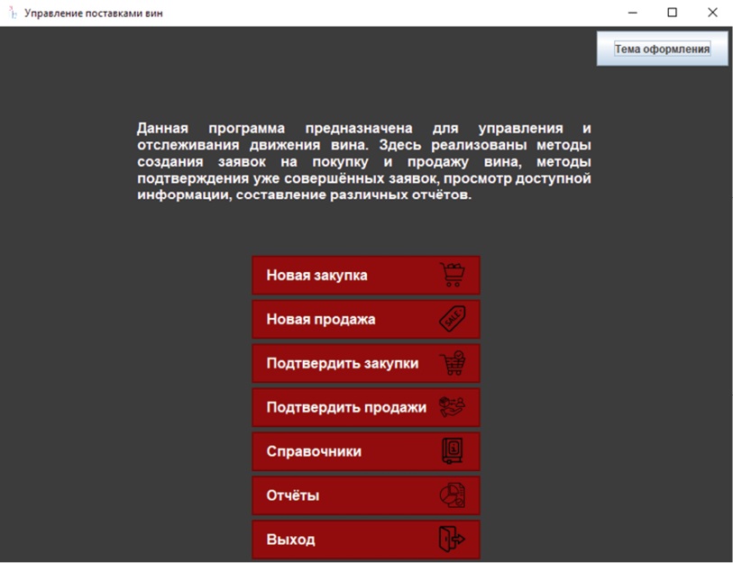 - Справочники – редактирование справочной информации о винах, поставщиках, покупателях и складах.