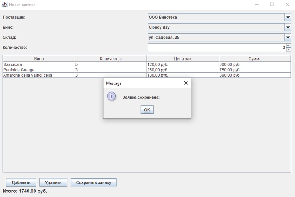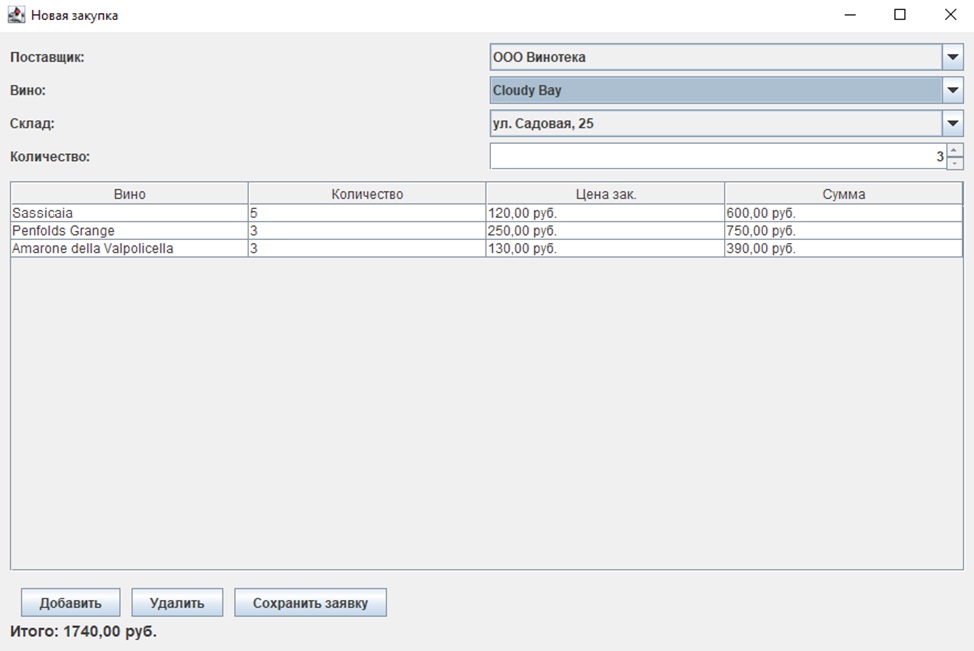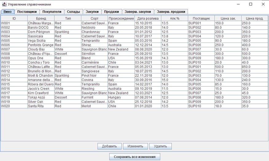 – полноценный функционал для ввода, редактирования и удаления данных о винах, поставщиках, покупателях и складах;