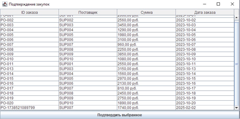 Окно для управления заказами (рис. 5–9) представляет собой ключевой элемент приложения, обеспечивающий интерактивное оформление продаж. Его функционал предусматривает выбор покупателя из списка зарегистрированных клиентов, указание конкретного вина (с учетом ассортимента), а также выбор соответствующего склада и требуемого количества. При подтверждении операции система автоматически обновляет сведения о заказах в общем списке и в режиме реального времени корректирует текущие складские запасы, отражая фактическое состояние запасов.