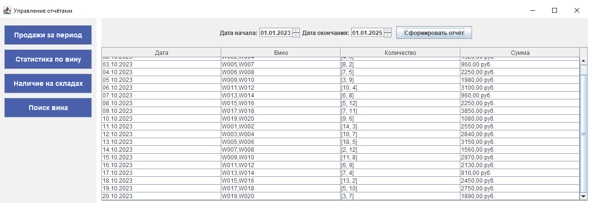 Окно отчетности (рис. 10) является важным элементом системы, позволяющим пользователю оперативно формировать различные аналитические сводки. В данном модуле реализована форма, которая предоставляет гибкие настройки для выбора параметров формирования отчетов, включая период (даты начала и конца), конкретное наименование вина или иные фильтры, связанные с продажами, закупками и текущими остатками на складах.