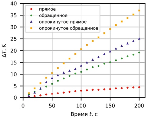 Таким образом, для сравнения интенсивностей процессов теплообмена можно использовать отношение скоростей нагрева поверхностей теплообмена (6). Анализ временных зависимостей изменения температуры в калориметре, представленных на рис. 5, позволил оценить скорости нагрева жидкости в калориметре для различных типов пламени.