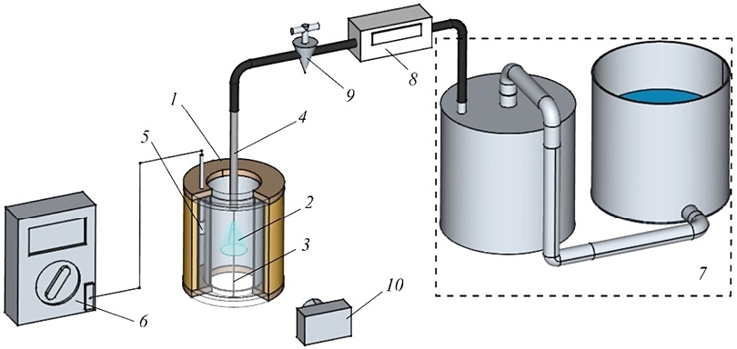 Рис. 1. Общая схема экспериментальной установки: 1 – камера калориметра; 2 – фронт пламени; 3 – стабилизирующий элемент; 4 – сопловой канал; 5 – термопара для измерения температуры; 6 – мультиметр регистрации сигналов; 7 – газометр вытеснения для подготовки газовой смеси; 8 – расходомер учета газа; 9 – регулирующий газовый кран; 10 – устройство визуализации (цифровой фотоаппарат)