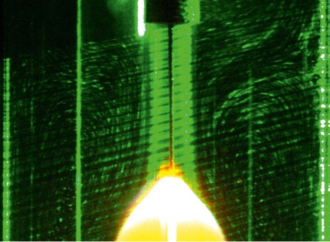 Для визуализации турбулентных потоков в пламени применялся метод светящихся частиц: в газовоздушную смесь вводились частицы окиси магния, поступавшие из контейнера, закрепленного на газовой трубке установки. Эти частицы освещались плоским лазерным лучом, что позволяло осуществлять наблюдение за формированием вихрей, их геометрией и расположением. Формирующиеся турбулентные структуры приводили к усилению теплообмена между областью горения и стенками камеры сгорания, оказывая значительное влияние на процессы теплообмена и протекание химических реакций во фронте пламени.