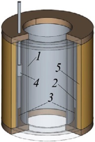 Рис. 2. Устройство калориметра: 1 – внутренняя стенка; 2 – внешняя стенка; 3 – изопропиловый спирт, 4 – термопара, 5 – теплоизоляция